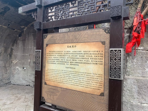 门口有“瓮城”的介绍:三面悬崖峭壁,具有“一夫当关,万夫莫开”险要之势,公元1862年(清同治元年)增修的瓮城为重庆唯一,是川东地区惟一保存完好的古代防御设施。穿过城门里面还有一个不大不小的坝子,四周都是城墙 类似于“D”型 叫做“翁城” 。在清代,这里的居民为了防御土匪 ,就把城门做了一个内城门和外城门的设计,如果土匪打进来就先关闭内城门, 打开外城门,引诱土匪进入, 然后关闭外城门 ,埋伏在城墙上的人就可以对土匪来个瓮中捉鳖。