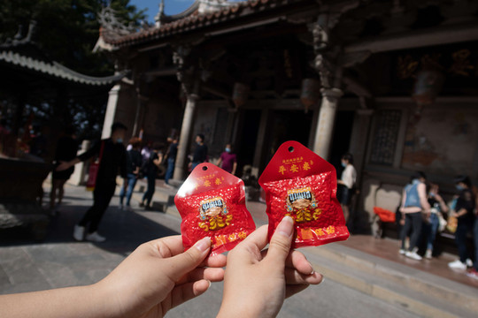 于别殿不同,天后宫中井是四方透光的,午后阳光恰好落在蒲团前,正正的在香客的手上,带着诸多美好愿望诉于妈祖的这三炷香显得尤其耀眼,青烟袅袅而上,我看愣了半晌,直到有人提醒,赶紧抓起一包平安米走出来。