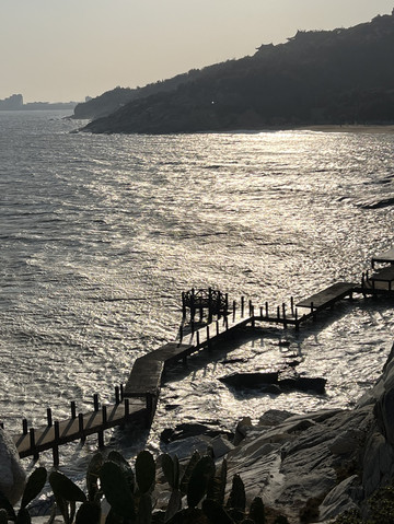 湄屿潮音这边有彩虹公路,彩虹色的公路配上海天一色的美景,让人流连忘返。这边的海边栈道离海更近,龙虎滩处海水可以敲打到栈道,涨潮浪大的时候不建议前往,路滑容易跌倒;凌波曲桥,是在海中的石桥栈道,探入海中蜿蜒曲折,走在上面好似凌波微步一般,恰好落日掉入山头,夕阳余晖映天印海,别有一番滋味。