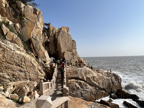 为什么叫鹅尾呢?是因为形似鹅尾而得名,是一座天然的地质公园,由于受风蚀、海蚀的双重作用,山上形成众多大小不一、形态各异的象形石,如海门、龟石、飞戟洞、斧劈崖、妈祖书库等,千姿百态,形神俱佳。鹅尾山的地表材质,被地质学家称为世界罕见的海蚀地貌,是一亿三千多年时间风化而成的独特奇景。岸边的鹅尾石呈现出鹅黄色,和海中的黑礁石形成鲜明对比,天空很蓝,唯一遗憾的是冬天的海水有些浑浊。这里很值得玩,最好是下午来,拍照很出片,随手一拍就是大片,网红打卡地飞戟洞也在这里,要拍上一张“穿洞看海”的照片要排队很久,其实,这里处处是美景,推荐指数五颗星,游玩时间2小时。