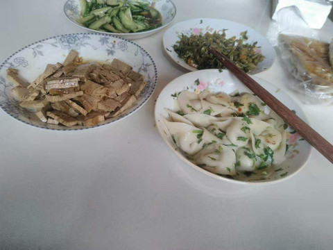 饺子配馕饼,五香豆腐干(我开始以为是肉),咸菜,黄瓜,这饺子好好吃,吃了两碗。还有一个是面粉搅成糊状,加辣子,配土豆丝,豆角啥的,我第一反应,这和小孩吃的糊糊不是一样的么,吃了一些,不过感觉吃不习惯,粘稠。