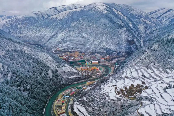 一座座红白镶嵌的藏式建筑群以雪山为伴
