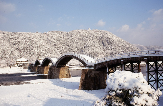 有着5个拱形的桥身,就如同5个拱门。纯木制的锦带桥,不仅构造精巧且造型独特。外加上周边的景色秀丽,一年四季透过拱形桥身可以看到不同的景色。