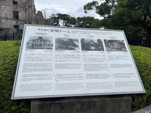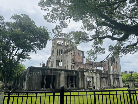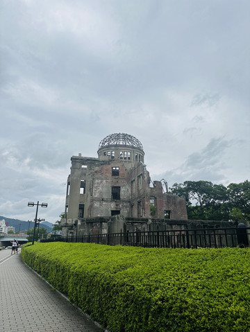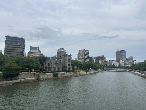 从地下街出来就见到了世界遗产——原爆穹顶。本来是捷克建筑家设计的陈列馆,在遭到原子弹轰炸时有一部分没有坍塌,变成了残骸而被保留下来。如今则化身成原子弹轰炸广岛的象征,承载着人们期盼世界和平的愿望。