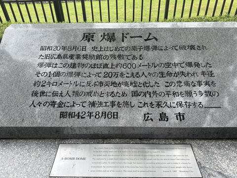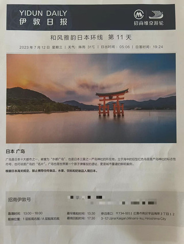 7月12日下午1点,招商伊敦号抵达广岛。当天停留广岛的时间非常短暂,最多只有5小时,只够进城参观原子弹爆炸圆顶屋(原爆穹顶)和广岛和平纪念资料馆。