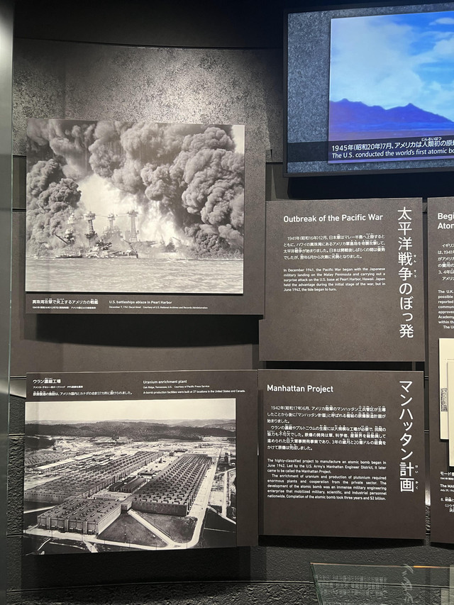 这段很明显避重就轻,偷袭珍珠港(他们用的是奇袭,毕竟偷袭难听了点)和太平洋战争都一笔带过,直接介绍曼哈顿计划。至于为什么日美之间会爆发战争,明治维新后的日本是怎么走上对外扩张这条不归路的,这些关键问题一概不讲。相比广岛一味地“卖惨”,长崎的原爆资料馆就十分客观了,下一篇我会详细描述。