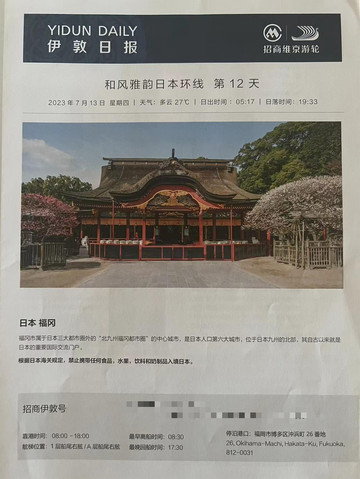 说实话,招商伊敦号停留在福冈的时间过长,可以说把广岛的时间都留给福冈了。再说福冈本来就是大型邮轮经常光顾的地方,游客既然都选择了招商伊敦,肯定希望船方把有限的时间留给新奇的地方,但愿以后招商维京在路线设计上能有所改进吧。