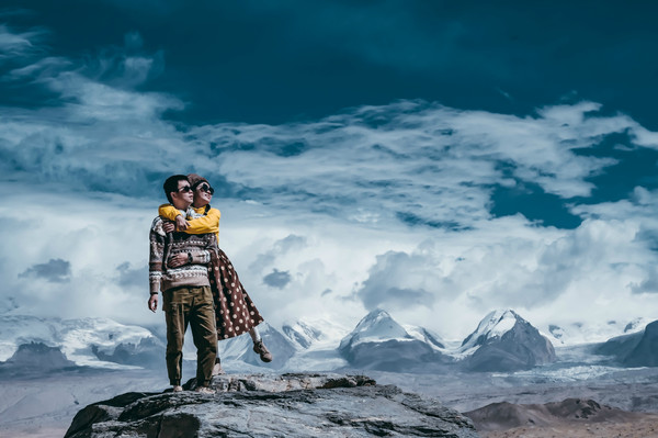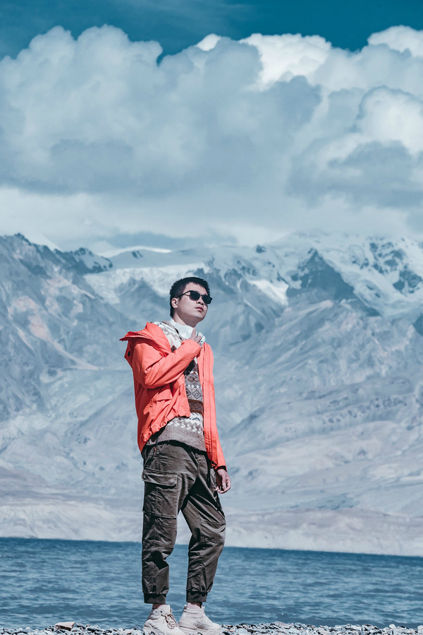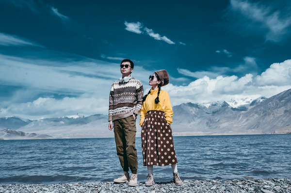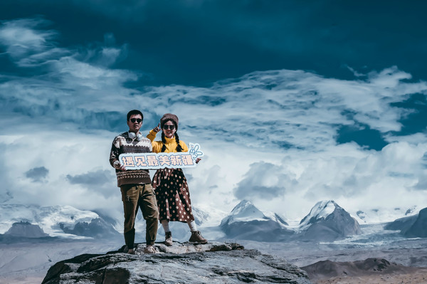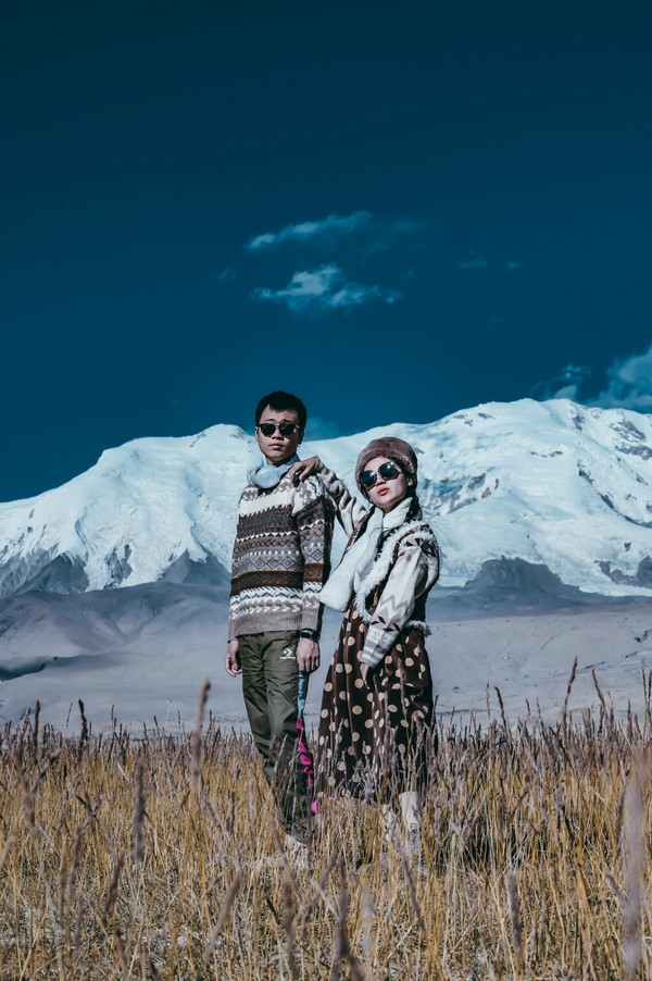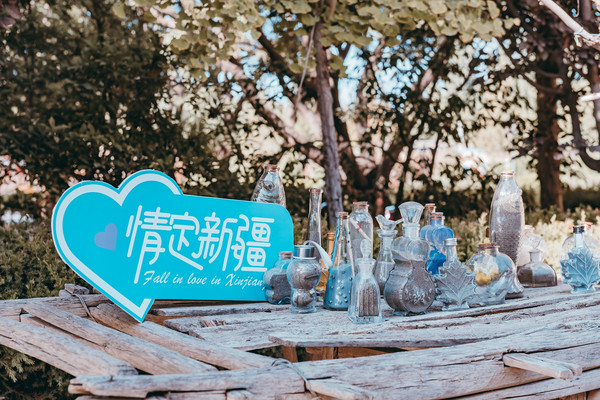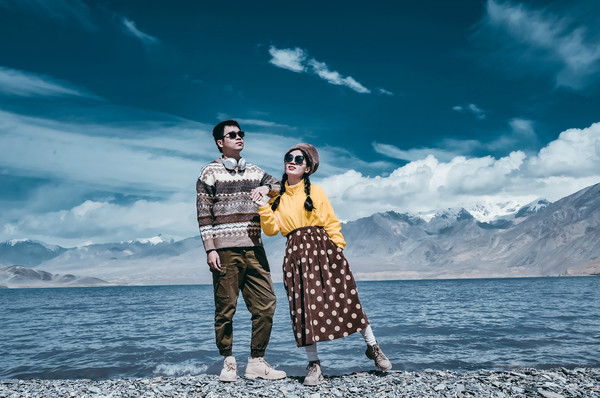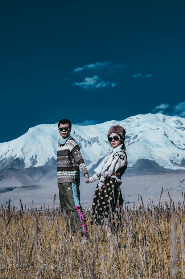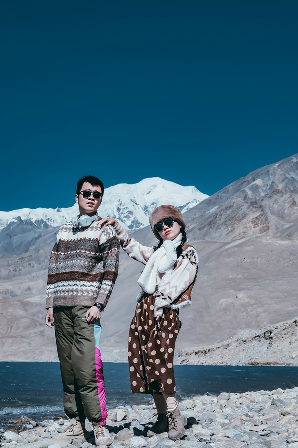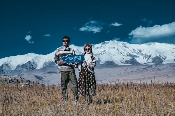 我们牵着手闲散地走着,看看雪峰的威严,观赏湖水的洁净,又对着白云进行无限遐想,天气有些凉爽,但我们彼此的心都是炙热的,我们拿起“情定新疆”的牌子,我觉得这四个字就已经是很好的概括了。