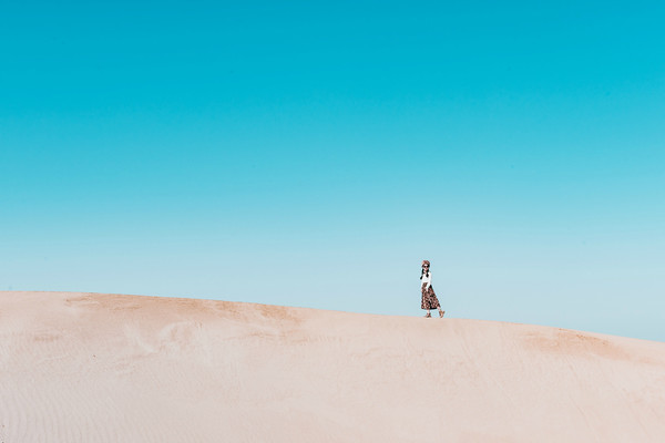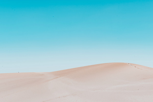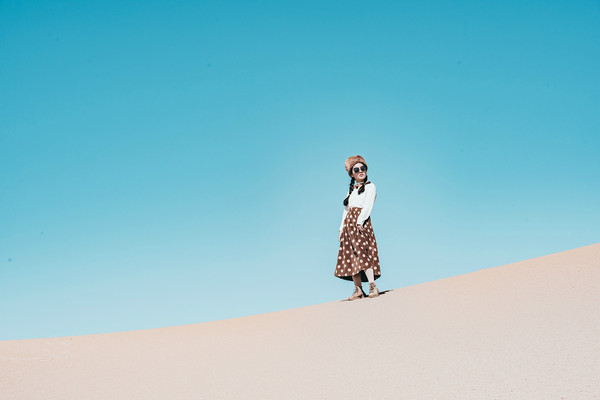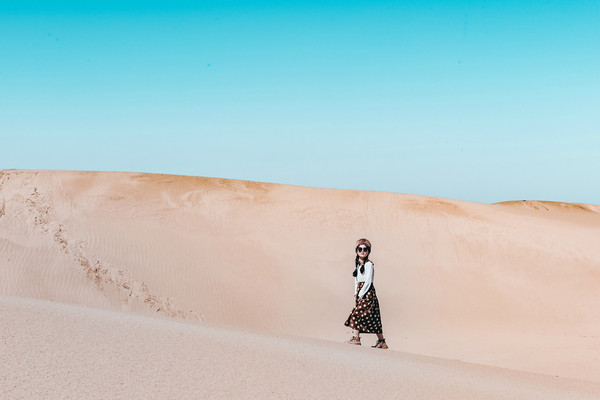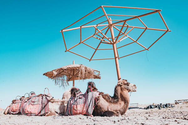 一番畅快过后,我们静下来欣赏大漠景色,眼前的画面是简约的,蓝天和黄沙的组合总给人一种大气的感觉,再和骆驼来一场互动,再美妙不过。