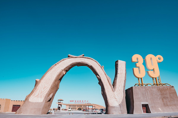 游客服务中心前的雕塑是很有特色的,像骆驼一样的“N”既是一个拱门,有代表着北纬39度的“N”,这样的设计让人看了不得不称赞一句“妙啊!”