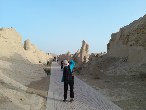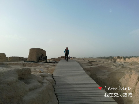 夕阳西下,这里仿佛人声鼎沸、战马嘶嘶、驼铃声声、商旅如梭。眼前这座故城,在历史的长河中,曾有多少征战西域的将士,为了祖国统一、国家兴亡,他们告别妻儿父母,从这里一去不归!又曾有多少商旅和使者踏着漫漫戈壁黄沙,或为财富或为交流,行走在这条艰难的古道上!他们远去的身影和脚步,仿佛在向人们诉说着交河故城历史的厚重和曾经的繁华。