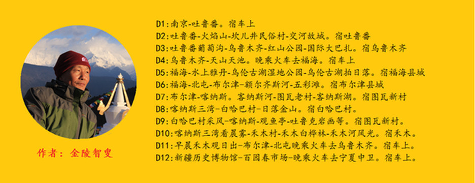 趁着浓浓秋意,期待多年的新疆北部之旅终于成行。当列车沿河西走廊驶出嘉峪关,进入茫茫戈壁和无际的沙漠时,不禁幡然感悟:眼前就是新疆,不到新疆,就不知中国之大,决不是一句简单说词。此行,我们将从新疆吐鲁番开始,一路向北,奔向天山天池、奔向福海雅丹、奔向布尔津五彩滩、奔向喀纳斯湖。去寻觅金秋北疆的美丽。