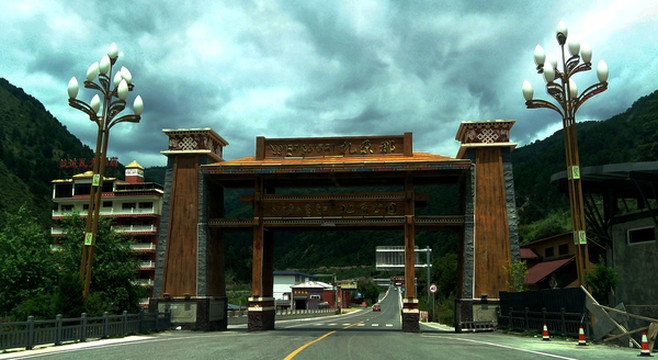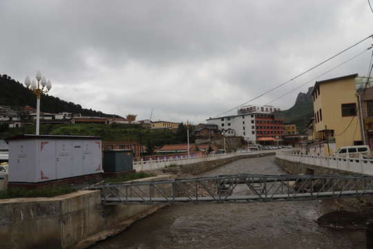 中间的白龙江为界,左边是甘肃省的朗木寺镇,右边是四川省的朗木寺镇