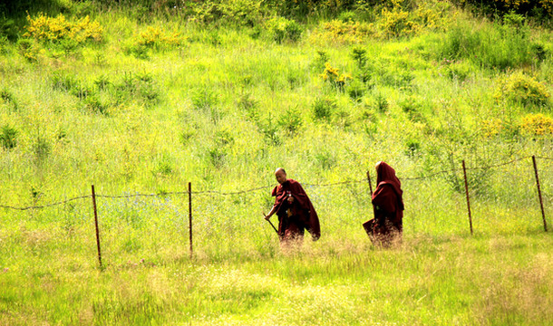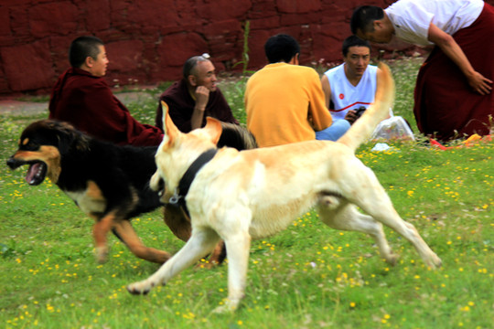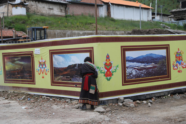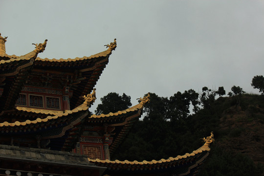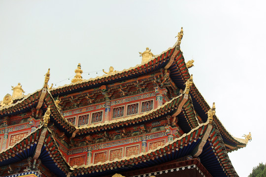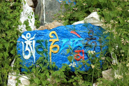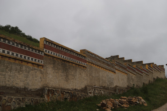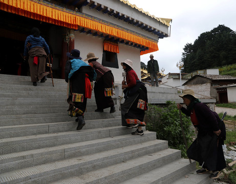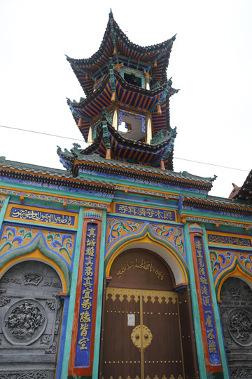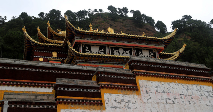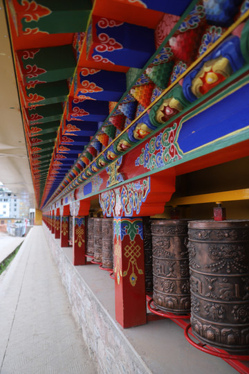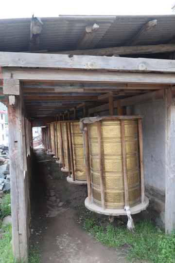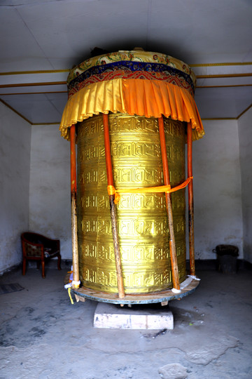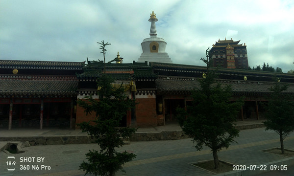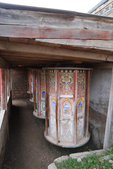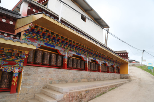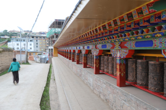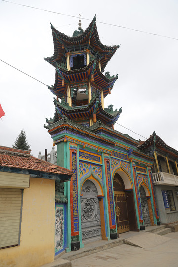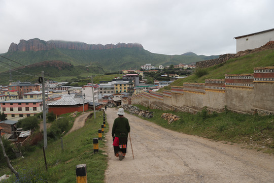 从山坡返回宾馆途中,看到一寺院,各种不同大小、颜色和图案各不相同的转经筒无时不在地显示着藏传佛教的标志。这里本是多民族聚集区,藏族、回族和汉族等各民族都在这里休养生息,这里有回族居民祈祷的清真寺,这里还有回民村。
