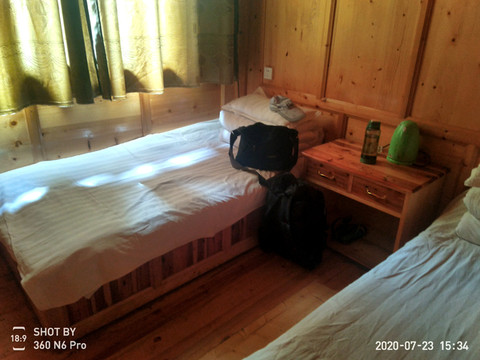 扎尕那由甘南藏族自治州迭部县管辖,我们拼的小车是下午2点左右到达景区大门附近,3点左右到达了扎尕那景区,我住在东硅村的一个客舍里。客舍是小木屋,房间不大,有两个单人床,价格比较实惠,只住我一个人,房间外面还有一个很大的观景平台,还是非常不错的。