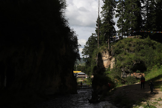出格尔底寺上行,即是白龙江源头的白龙大峡谷(又称纳摩大峡谷),峡谷出口处是一块平地,不少游客在一这里休闲、聊天、野炊。进到峡谷里面,溪水沿峡谷顺流而下,水量不大,离峡口不远处有仙女洞等洞口。