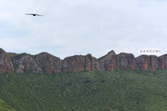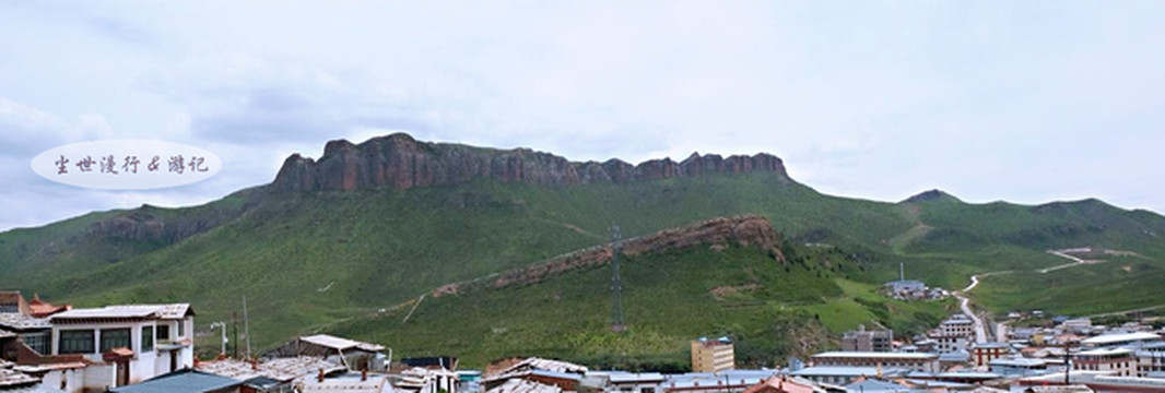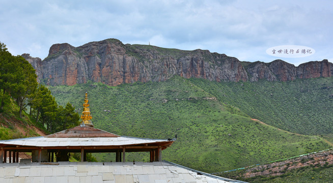 寺东,舒缓的山体顶部突拔起高耸的红岩赤壁,是郎木寺的标志“红石崖”。