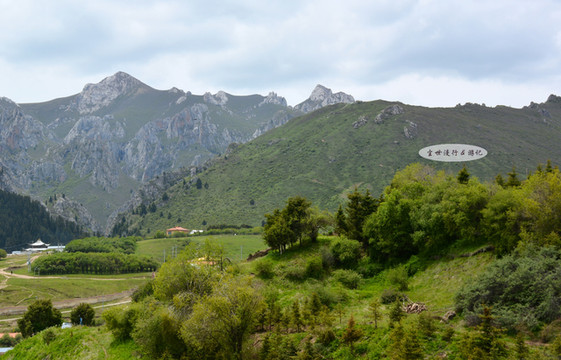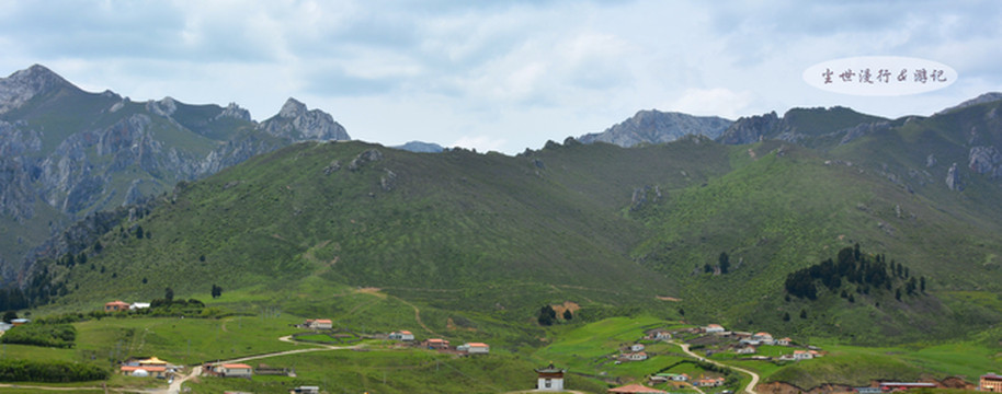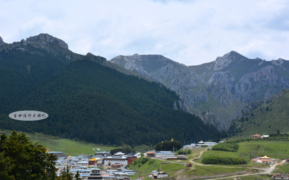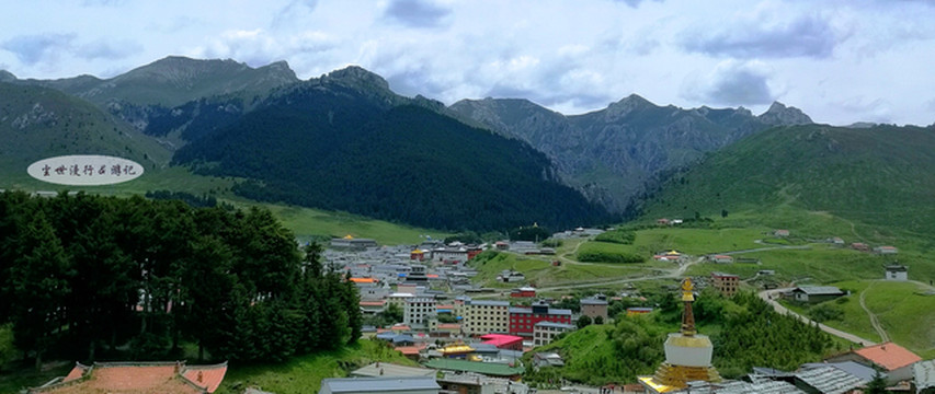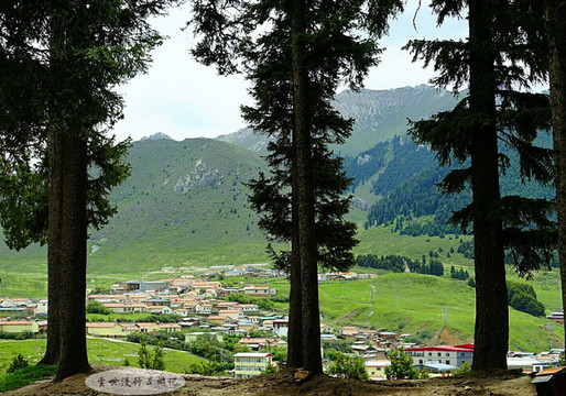 透过松树眺望郎木寺镇——平缓起伏的青翠山丘后面是山石峻峭的高山,高山上是挺拔苍翠的冷杉;绿色的山丘合围着一片狭长河谷,红瓦白墙掩映在河谷中。郎木寺镇风格独特的自然环境,有些相似阿尔卑斯山脉的风景,难怪会被称为“东方小瑞士”。
