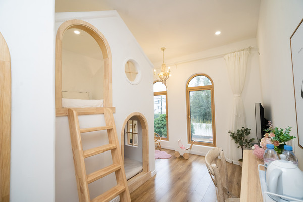房间:使用的是白色床品,很干净,味道闻起来也很舒服,没有酒店那种刺激性气味。各个区域的卫生都很干净,早上起来会看到保洁阿姨忙忙碌碌打理公共区域的卫生。我们住了两天,晚上回来房间清扫过,毛巾浴巾纸巾等物品也有补充,很贴心哦。房间是上下床树屋的,小朋友一进房间就开始摆弄小玩偶小玩具,爬上爬下超开心;滑梯在一楼,还包了防撞条,很安心;庭院面积很大,有秋千,戏水池,沙堡,住两天都很够玩。