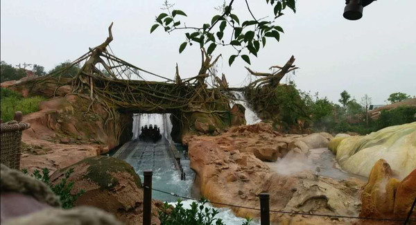 巡游结束都已经将近四点了,我可不想再错过FP。于是尽快赶到了雷鸣山漂流那边,在等待过程中穿上了早就准备好的一次性雨衣,没想到我的雨衣的帽子竟然是坏的(雨衣是我上一年参加长跑运动时免费发的),无语且无奈。这个漂流一点都不刺激,我们同船的人一直在说说笑笑。直到最后快结束时才有一个不高的下坡,结果水全往我坐的位置灌了进来,瞬间将我浇了个透心凉。头发湿掉了,鞋子也进水了。还好阳光不错,可以晒晒。看到人造高山和瀑布前面还有一个绳索项目,有点儿跃跃欲试。但又实在想再玩一遍沉落宝藏和极速光轮,就又继续前进。