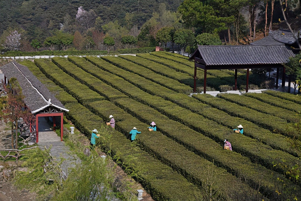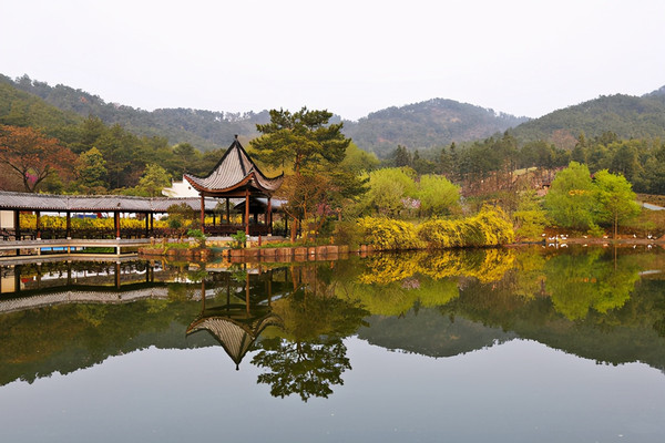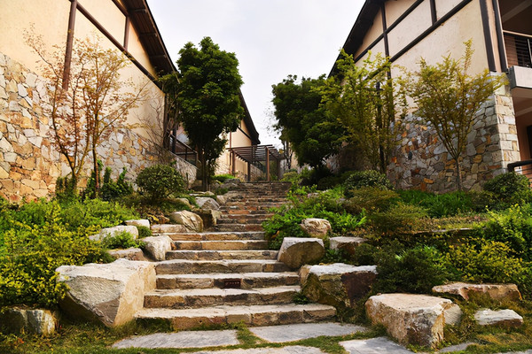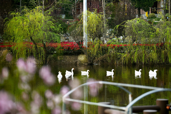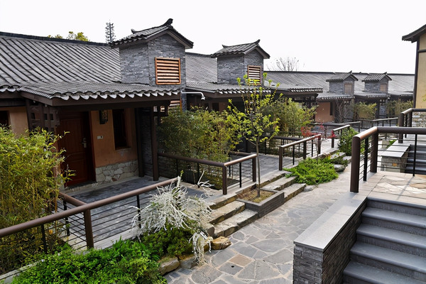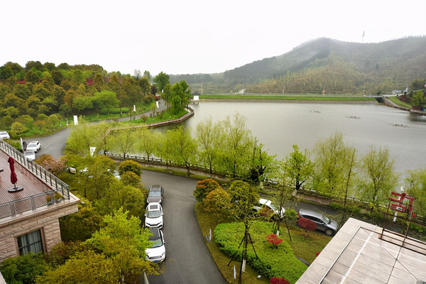 在银杏山庄度假酒店,山前水畔,一片高低错落的房子,灰瓦黄墙与周围景观和谐地融为一体。山坡上用石块和花草树木布置成一片精致的园林,小桥流水,绿树春花,清新,优雅,安逸,舒适。