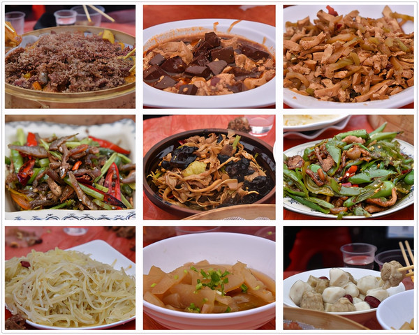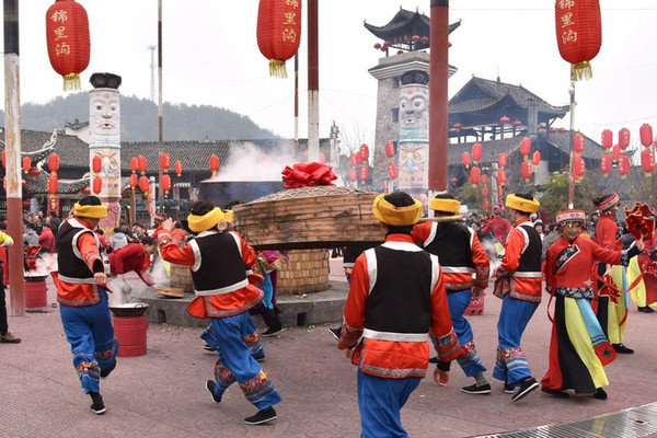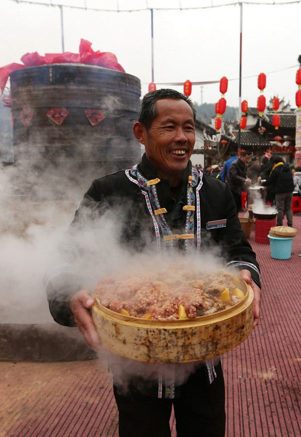 小伙子们抬着蒸笼,蒸笼里是土家人特有美食格子肉,也叫“抬格子”,是年猪宴上的主菜。每到杀年猪时,土家人将猪肉、土豆、萝卜、老南瓜等用玉米面拌好,用大蒸笼蒸熟,以招待亲朋好友。一层层蒸笼摞得很高,要蒸四十多分钟。格子肉,摔碗酒,加上精彩纷呈的歌舞杂技演出,感受浓浓的土家情,浓浓的年味。