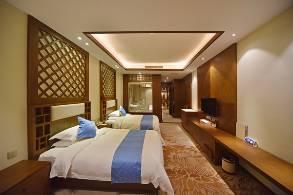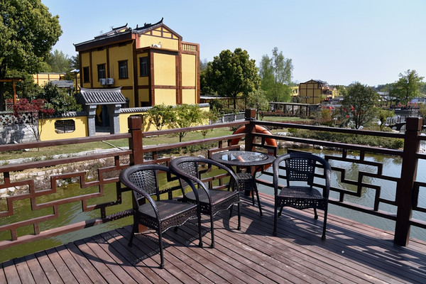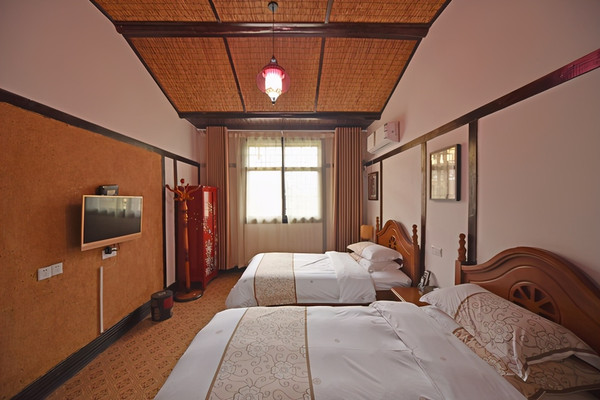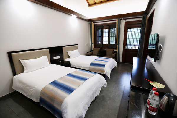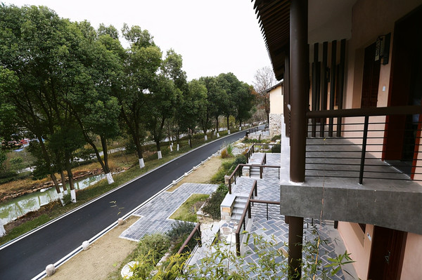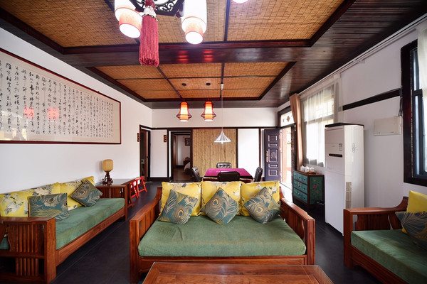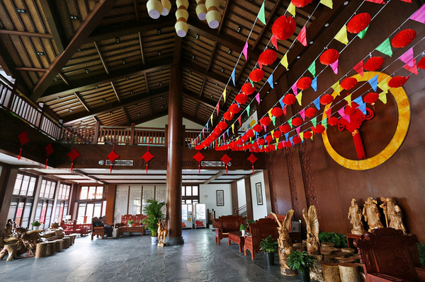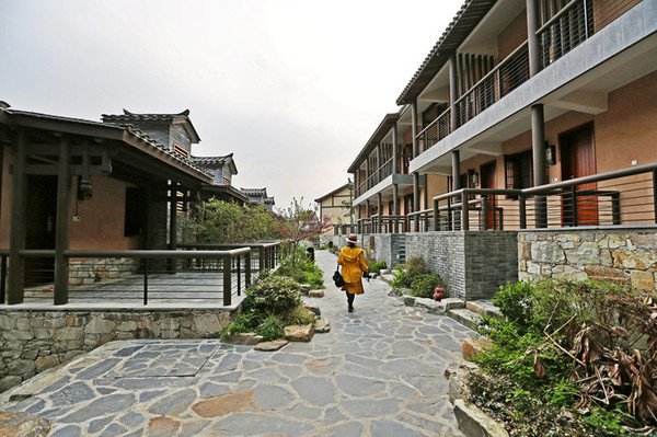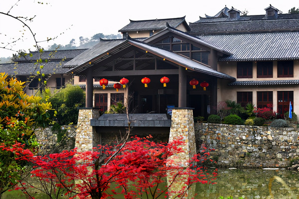 一栋栋建在山坡之上的两层小楼高低错落,虽然都是现代建筑,却采用了与当地民居相似的风格,给本地人以亲切感,也给外地人以新鲜感。宽敞的大堂装饰得古朴大方,精致的木雕,复古的茶座,既有乡间野趣又不失庄重典雅。