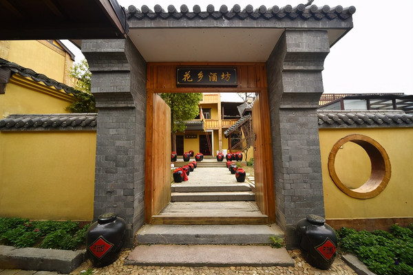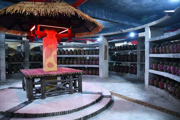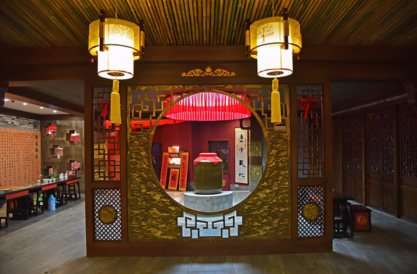 穿过厅堂走进酒窖,由中心向四周层层拓展,一圈圈,一环环呈现出太极八卦形状,与整座酒庄建筑方形外观方相呼应,构成“外方内圆”的结构。一层层架上整齐摆放着数不清的酒坛,主人说最多可放置三万个,每个都有各自的编号。酒窖还提供私人定制服务,家里的好酒可以像存银行保险柜一样存在酒窖里,放到需要的时候取走。过去很多地方有存酒的习俗,女儿红、状元酒、长寿酒如此等等,寄予着各种美好的希望和祝福,有了这样的酒窖,就不必自己埋藏,还能更好地保证酒的品质。酒坛有大有小,最大的可盛放一吨酒,当之无愧一座美酒的银行。
