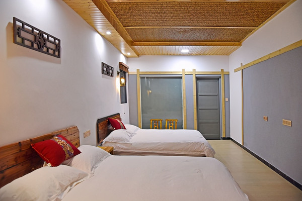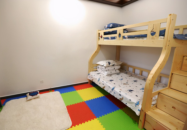 外表简朴的房子,内部却并不简陋,各种设施配置完备,不仅有双床房、大床房、家庭房等常规房型,还有几间专门设置了带地垫和上下铺的儿童房。房前屋后袖珍的小院给住客提供了室外露天活动的一席之地。