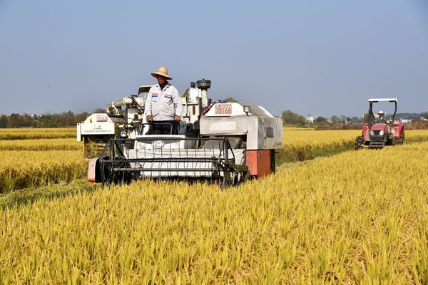 在水稻生产田,收割机、拖拉机正在穿梭忙碌着,村里的稻田从插秧到收割已经实现了全程机械化,农业机械的推广使用大大提高了劳动效率,胡兴咀的农民彻底告别了面朝黄土背朝天的辛苦劳作,负担减轻了,收入提高了,开启了新生活。一条条,一块块稻田很快就收割完毕,金黄的稻谷从收割机出来,装满拖拉机的货仓。收获的喜悦洋溢在脸上,丰收的图景铺满在田野。