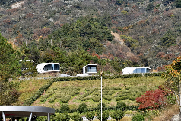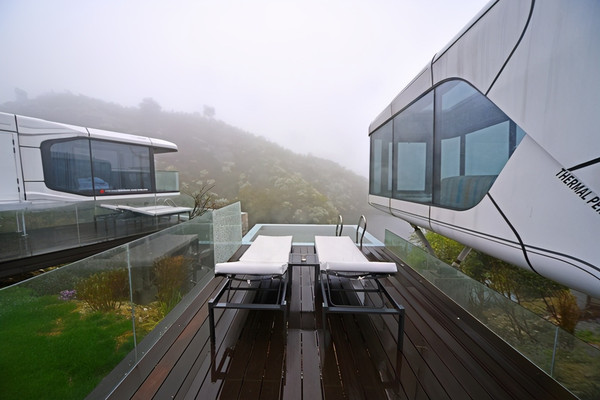 清凉寨度假酒店对面山坡上还有一处树影行星民宿,独特的造型一下吸引了我们的注意。于是第二天顶着小雨在云里雾里前去一探究竟。