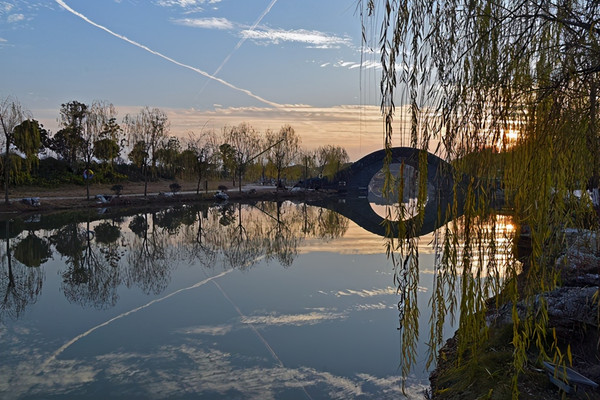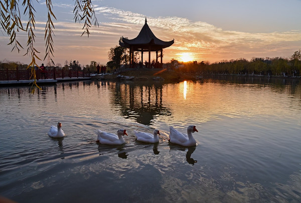 在河东生态观光区有一座国防教育知识馆,陈列了数十种先进武器装备模型和我军光荣辉煌的历史,是一处开展国防教育和爱国主义教育的好场所。还有专业的演出团队表演精彩的歌舞节目。傍晚时分,夕阳西下正是拍照的好时候,大门和亭台倒映在平静的水面,构成一幅秀美的风景。太阳渐渐降低,阳光呈现暖暖的色调,映红了晚霞,与水边的徽派建筑相映成趣。夕阳、晚霞、凉亭,水鸟,又一幅美妙的画卷。