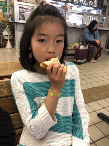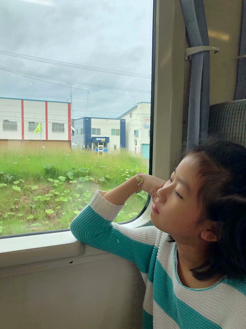 连车站的立式乌冬面馆都售完。摸到包里,还有早上做的三明治,没吃完,拿出来给她啃,小样儿吃得挺满足。真是个好养活的孩子啊!