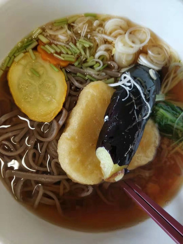 蔬菜荞麦面,栗子是被荞麦面给误导了,这里面的蔬菜就是红薯茄子之流,她完全不感冒。