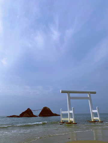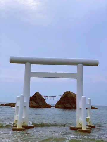 休息片刻,继续进发下一个点,期待着见到床说中的海上鸟居,不知道为何个人对日本的鸟居(神社的入门,类似牌坊的日本神社附属建筑,代表神域的入口)有一种莫名的好感,甚至是亲切感。一路路过了系岛的农产品市场,最终到达了我本次心中的目的地- 樱井二见ヶ浦夫妇岩,是由一座根据涨落潮会在沙滩上或者还海中的白色鸟居和一双连着“注连绳”的“男岩”和“女岩”两座海岩构成的美景。“樱井二见ヶ浦夫妇岩”入选“日本渚百选”之一。两座石岩受浪涛的侵蚀凹陷成心型的洞门,平常隐藏在海中,大潮前后的退潮时会显露出来。夫妇岩义如其名,象征结缘,由一条绳子绑在大小2个岩石上,男岩高7.55m、周长9m、女岩高7.3m、周长16m