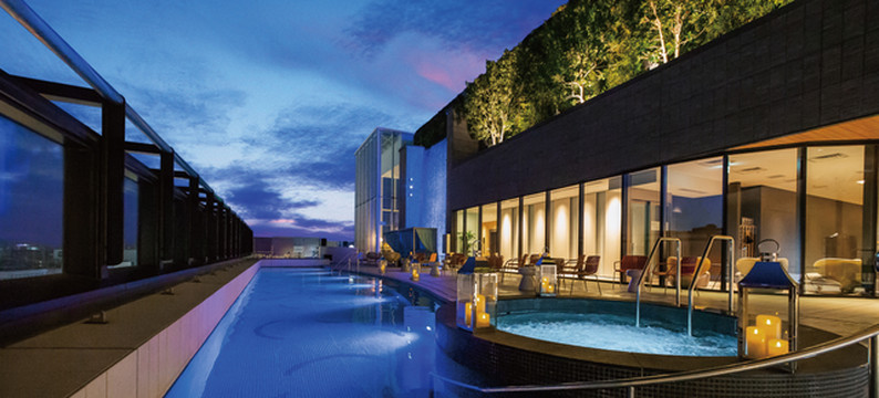 博多都酒店直接与车站相连,步行仅需一分钟。酒店的设计以“绿色、水、光“为概念,绿植与镜面建筑在设计师的手中完美结合,并且酒店顶楼的天然温泉区有水帘瀑布从8米高处直流而下,非常引人注目。