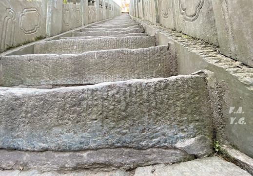 古神道大修记:乌鸦岭至金顶古神道始建于明清,历经数百年破损严重,公元2003年始,全面大修。修缮总长4800米,安装踏步6560级,搁板820套,铺地墁石5770平方米,人工搬运物资10000余吨,总投资1000万元,历时900天竣工。