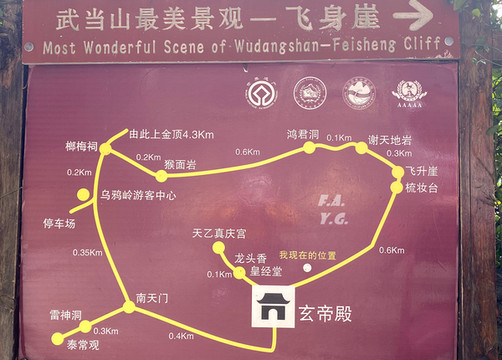 武当山景区内几个重要点:太子坡、逍遥谷、紫霄宫、南岩宫、琼台中观和太和宫、金殿,还有山脚下武当山市区里的玉虚宫。
