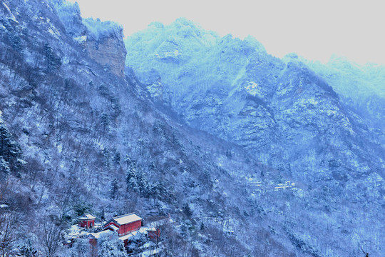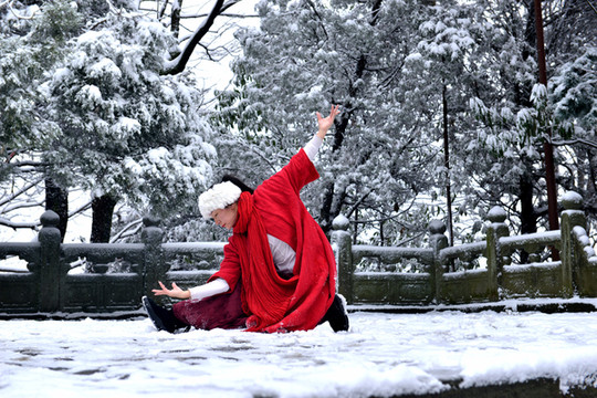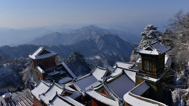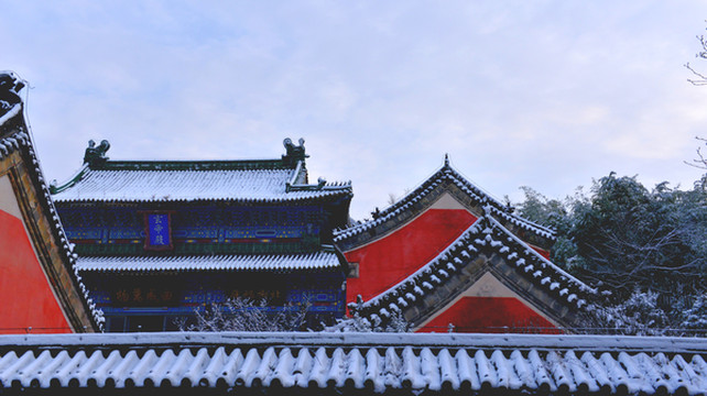 下一个景点是紫霄宫,是道人们清修的宫观。此时山、林、桥、柱上已被很厚的积雪掩盖,整个世界一片白色,眼前的红墙宫殿被白雪掩映,道姑在雪地里轻盈的脚步伴着雪花飞舞,有一种穿越回古时的感觉,相信此时所有人都已忘记尘世的俗扰、身体的冰冷,内心平静如水,天人合一了。