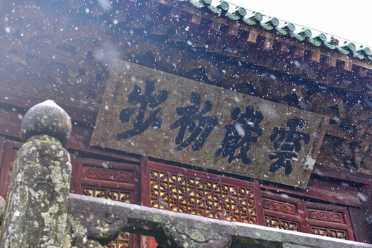 今年疫情的原因,湖北省的5A景区都免门票,第二天一早,我们在游客中心买了景区巴士票,105元/人,便跟着游客上车了。大山里早已经飘起了雪花,山间的树梢上已经有积雪,林间已经是白茫茫了。大巴一路在山间盘旋,很快到了太子坡,我们步行了近百米的台阶后,转眼见到了一座红墙绿瓦、庄重典雅的大门,上书:太子坡。过了这座山门,就是古代建筑大师们顺依山势,建起的犹如波浪起伏的夹道墙,被称九曲黄河墙。漫天雪花里,我们在夹道墙里步行有一种九转千回,豁然开朗的梦中感觉,悄然间步行至幽静雅适的复真观里来,此时雪越下越大,如爆米花般的雪花飘过大殿前的匾额:云严初步,沧劲有力的颜体,这一幕瞬时有种时空转换,时间停步的错觉。“云严初步”这四个字我们当时搞不清楚,回来请教百度才知道这是指玄帝太子当年初入武当山在此修炼,已经进入云外仙境之意。