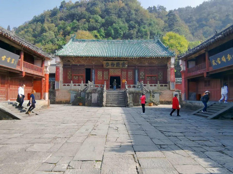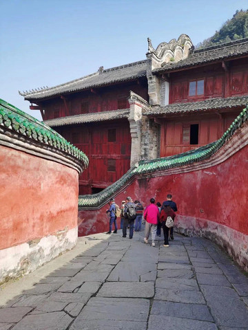 紫霄宫始建于北宋宣和年间(1119年-1125年),元代重建,名为“紫霄元圣宫”,明永乐十年(1412年)扩建,赐额“太玄紫霄宫”。紫霄宫依山而建,前疏后密,层层崇台气象森严,殿堂楼阁鳞次栉比,红墙翠瓦宏大壮观,威严肃穆,极具皇家道场气派。