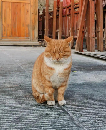 庙檐下的小猫却没那么有精神,眯着眼睛似还在梦中。