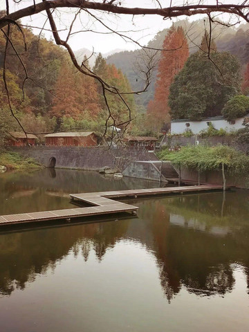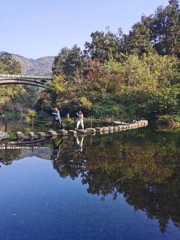 湖中有木道和石桥,石桥分隔着高低不同的湖面,木道引领向山林深处的茅屋,湖岸浓秋环拥,湖心清亮见底,走在这样的美景中,心情也逍遥雀跃起来。