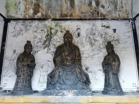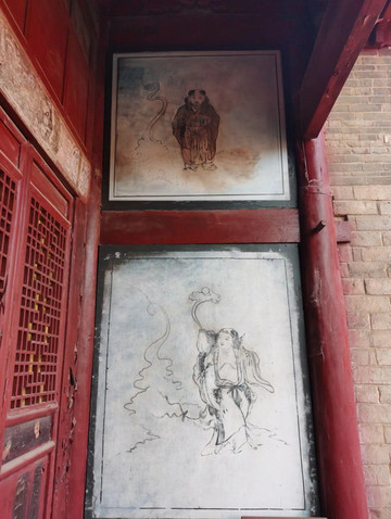 刘海戏蟾壁画:刘海是道教南五祖之一,刘海修道伊始,其师嗜财如命,因贪财而招致陷害,坠落万丈古井,刘海多方营救不成,就以串钱引诱,其师见钱眼开,手脚紧握钱串,被救出井,化为三足蟾蜍。(刘海戏蟾有多个版本)