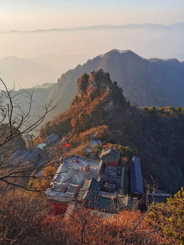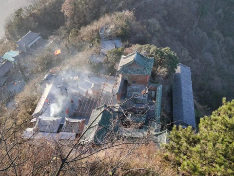 金顶俯瞰,宫观建筑群依山就势,布局巧妙,与周围山峰交相辉映,“天造玄武”,让人叹为观止。