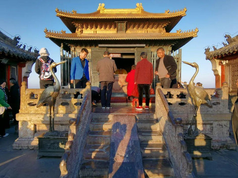 金殿敕建于明永乐十四年(1416年),位于天柱峰顶,海拔1612米。殿内供奉真武大帝铜铸鎏金神像,金童玉女捧册端宝侍立左右,水火二将执旗捧剑拱卫两厢,神案下有龟蛇二将,上方高悬康熙皇帝御笔“金光妙相”金匾。