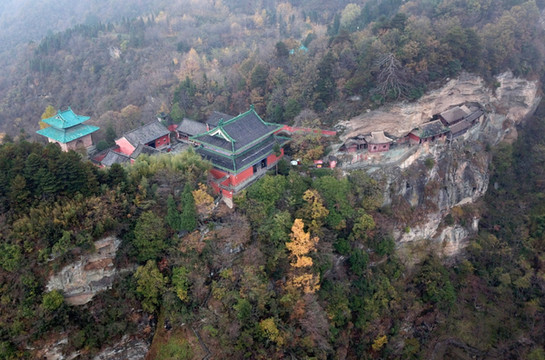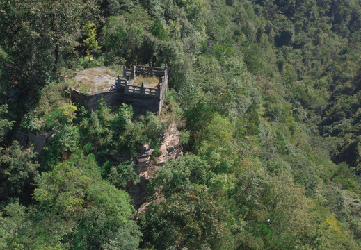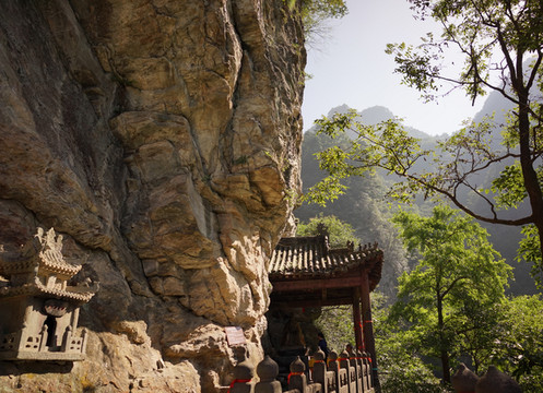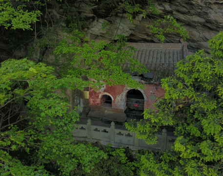 11,长生岩,在五龙峰腰间。面临绝壑。东汉丹家阴长生隐居于此,故于明宪宗成化12年(1476年)7月7日赐名“长生岩”。据传为原五龙宫藏粮之所。是一个天然的石窟,平拱顶,长宽高均在六米左右。坐西朝东,三面岩壁,一面临崖,崖下绝壑。临壑的一面,用城砖干摆精筑了一面墙,并空有一扇窗,后壁依崖而凿有神龛,现无神像,崖壁右侧凿有地仓,长2.75米、宽1.45米、深1.15米。