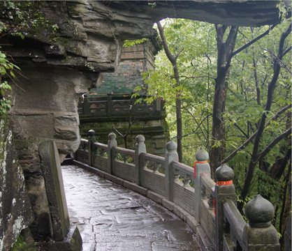 脚蹬岩又名云雾岩,在南岩宫右。穹隆如屋。在此仰视,可见岩顶上留有巨人足迹)
