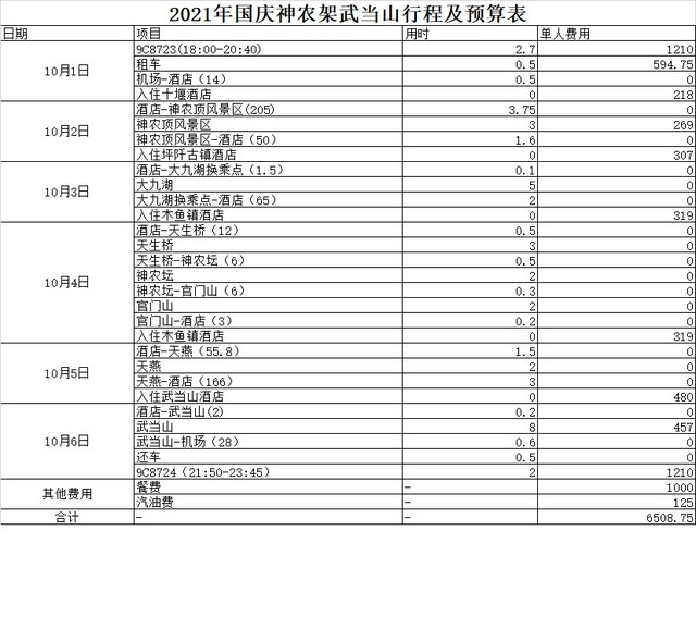 原定国庆去甘南,临行前几天发现当地降温且下雪,景色自然大打折扣。查了很多地方,发现神农架的天气不错,景色也不错,就在国庆前一周临时改去神农架了。先附上行程和预算表: