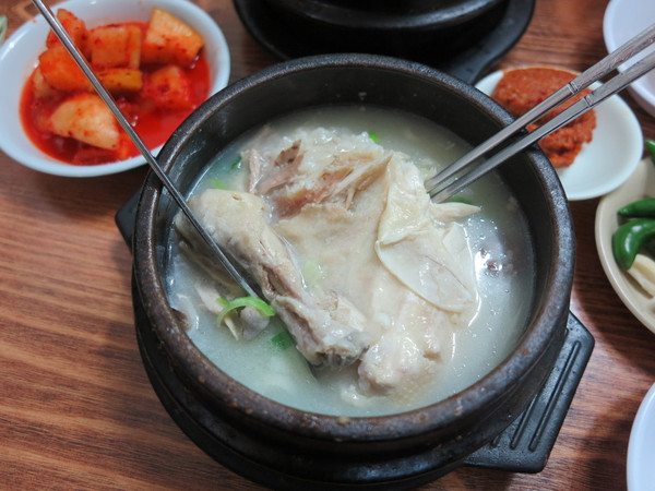 市场信息服务点给了我们精确的信息,毫不费力的找到了这里唯一的参鸡汤店,我们不敢去北村参鸡汤排队,就在这里的小街道上解决一下,没有伙计只有一个老婆婆的店,不会英语但不会阻碍我们的交流,好吃的参鸡汤,糯香的糯米,老婆很喜欢。